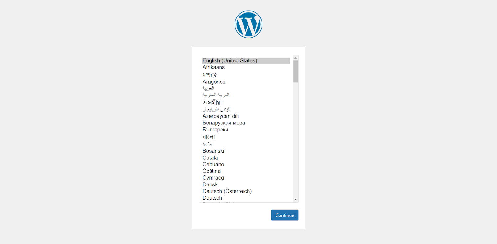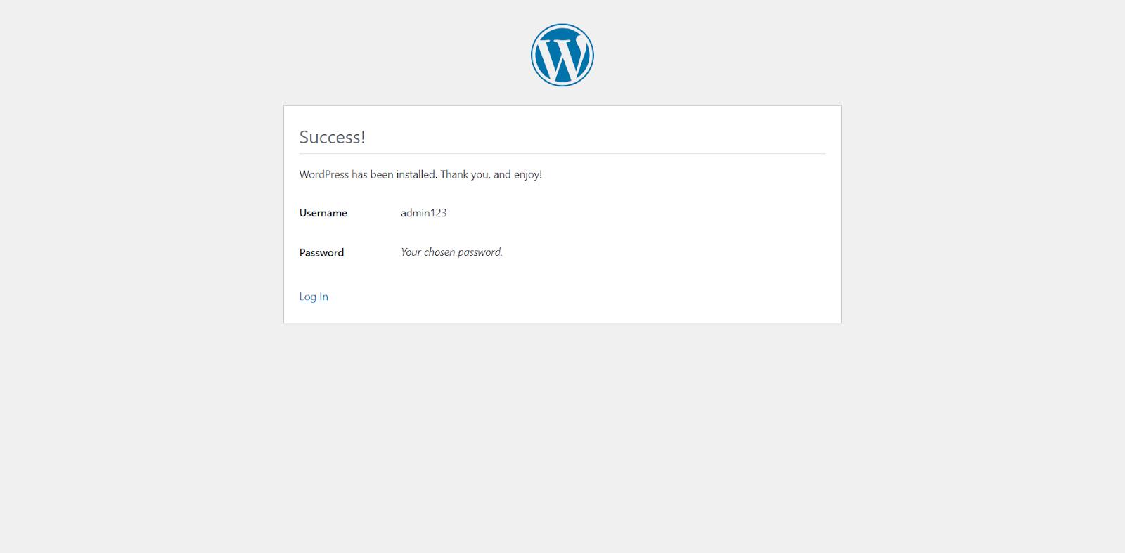 Finally, click “Install WordPress“. Once the installation is complete, you will be greeted with the following screen: