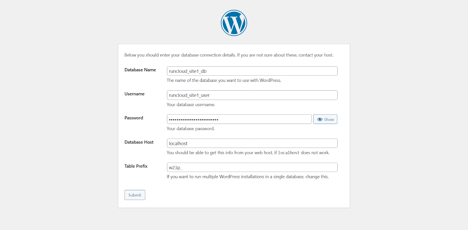 In the next step, you’ll be asked for database information. Enter the details you created in Step 3: