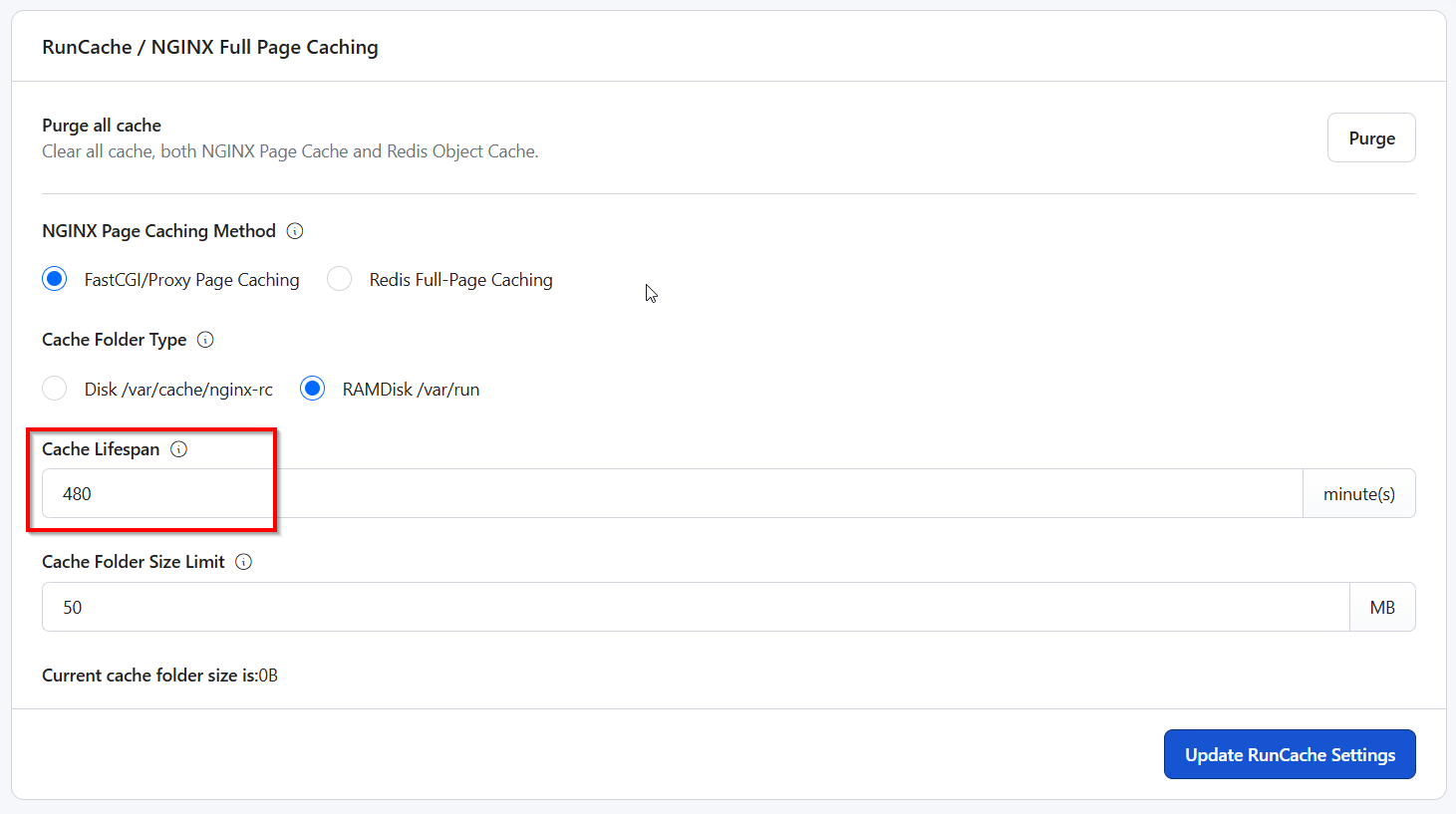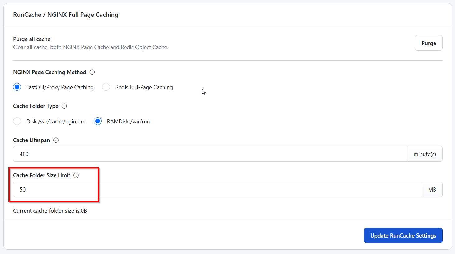 In RunCloud Hub, you can easily configure this by modifying the “Cache Folder Size Limit” value in your RunCloud dashboard.