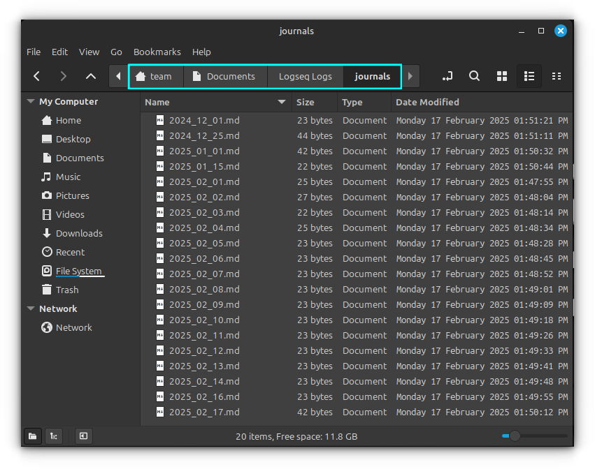 As the name suggests, this is the daily journals page. Whatever you write under a date will be saved as a separate Markdown file with the date as the title. You can see these pages in your file manager, too. Head to the location you use for Logseq, then visit the journals page.