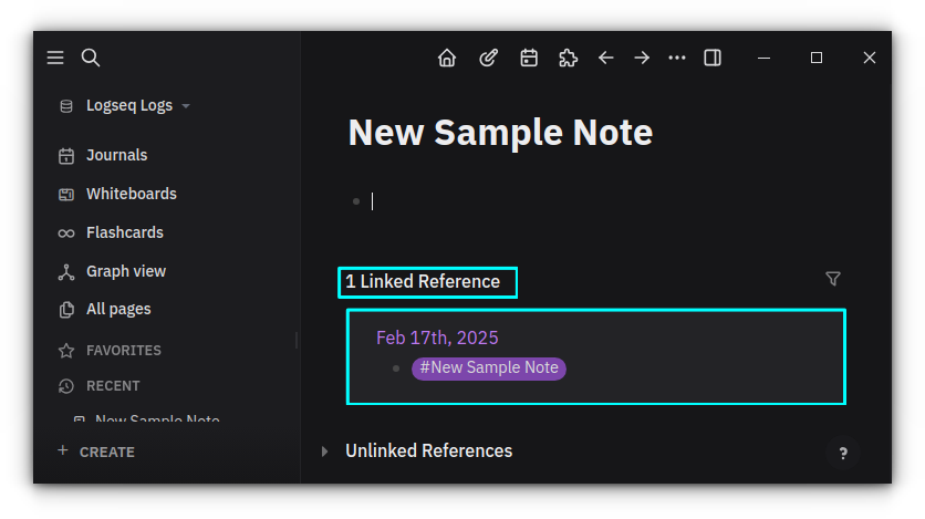 Logseq has a powerful backlink feature. With this, if you use the Journals page to create a new page, you don’t need to add any date references inside the page separately, since at the very end of the page, you will have a backlink to that day’s journal.