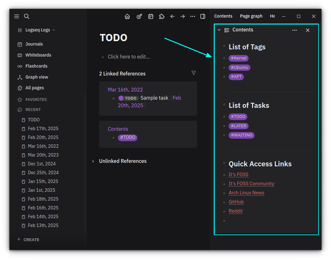Logseq has a special Contents page type, but don’t confuse it with the usual table of contents. That is not its purpose. Here, I will mention the way I use the contents page. You can create your own workflows once you know its potential.