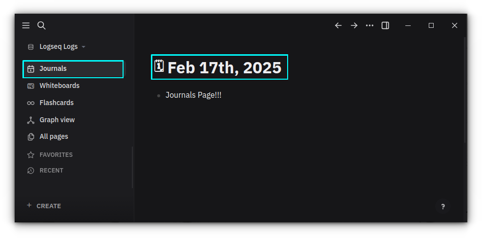 The “Journals” is the first page you will see when you open Logseq. Here, you can see dates as headings. The Logseq documentation suggests that a new user, before understanding Logseq better, should use this Journals page heavily for taking notes.