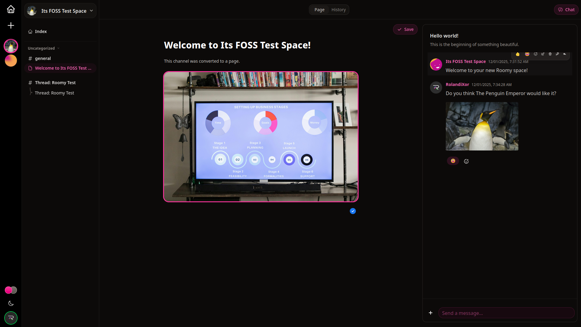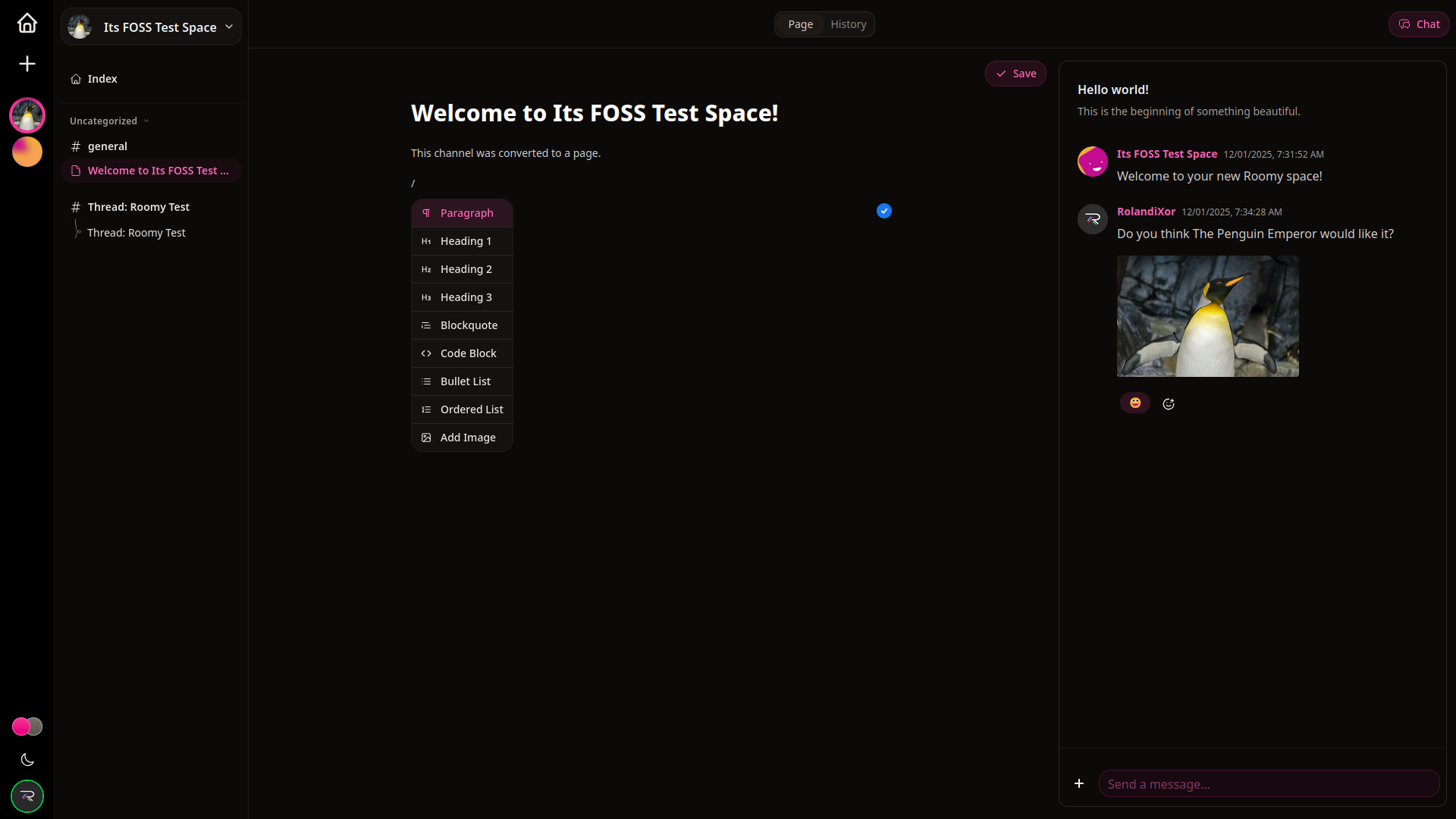 A cool feature of Roomy is that content isn’t locked into one format: Messages can be converted into threads, threads into channels, and channels into pages. Not all of these conversions are reversible, but having this feature in the first place is definitely a unique feature. It’s a clear indicator that Roomy isn’t just trying to clone Discord’s interface. Rather, it’s a rethink of how community knowledge and conversation evolve over time.