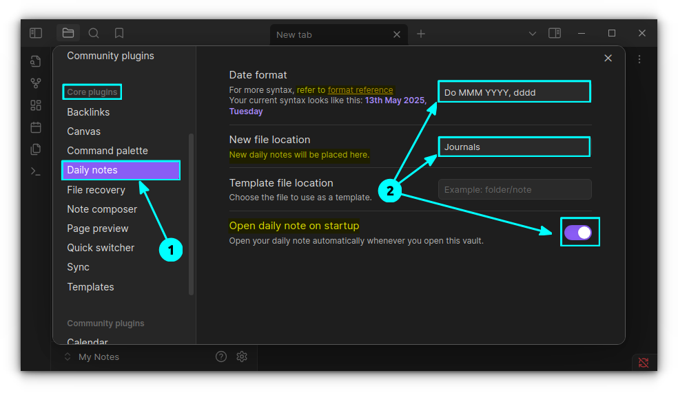 • New file location: I have created a separate folder called Journals in my Obsidian vault to store all the daily notes.