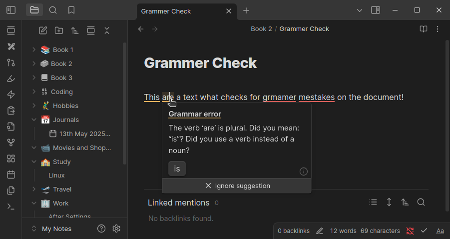 Spelling and grammer check in Obsidian using the LanguageTool Integration plugin.