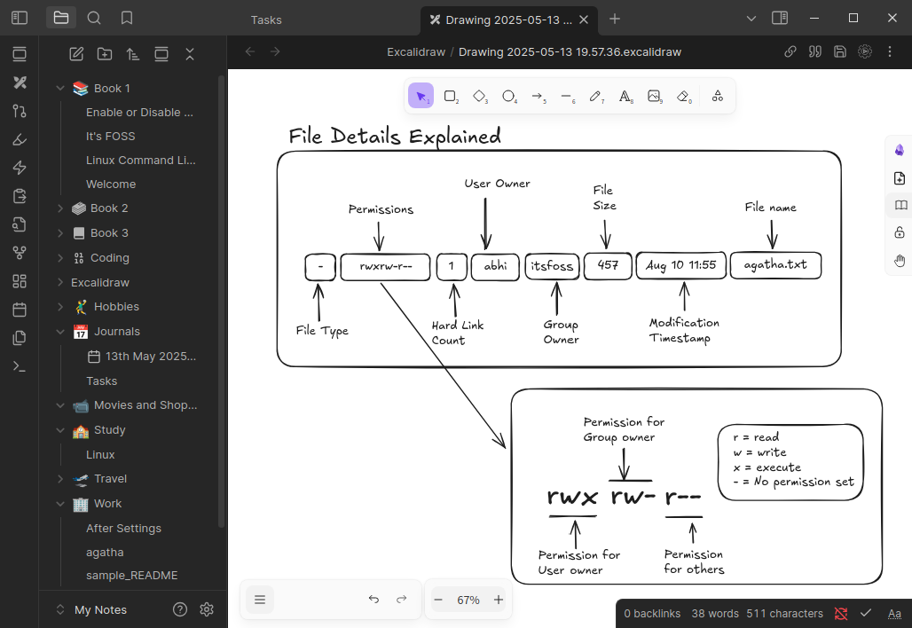 Excalidraw drawing in Obsidian. A sample drawing showing Linux File permission and details.