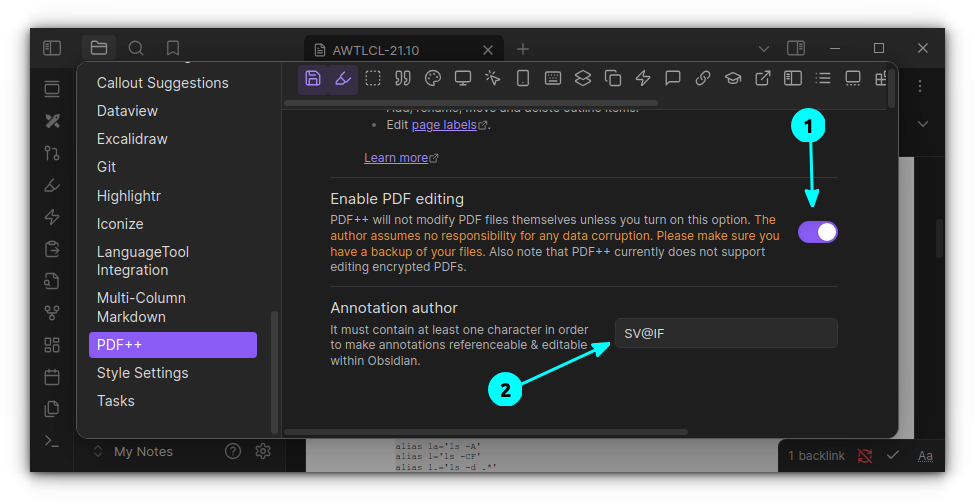 Enable PDF editing using PDF++. PDF++ plugin settings.