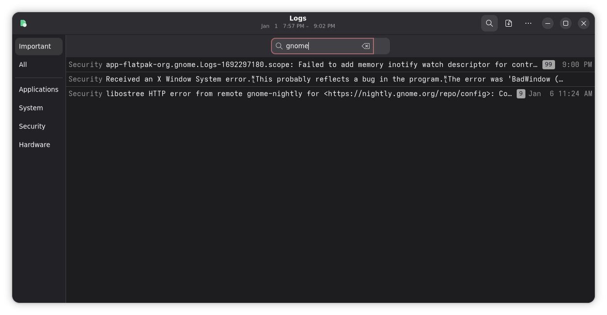 Viewing system logs in GNOME Logs