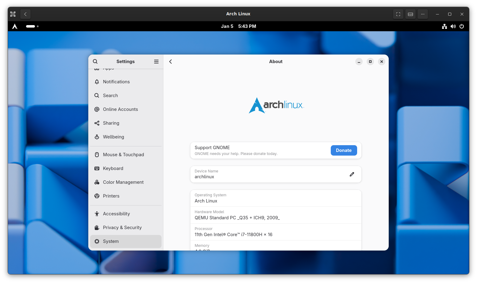 GNOME Boxes makes QEMU a breeze to use, even for inexperienced users. Also, I run Arch, btw.