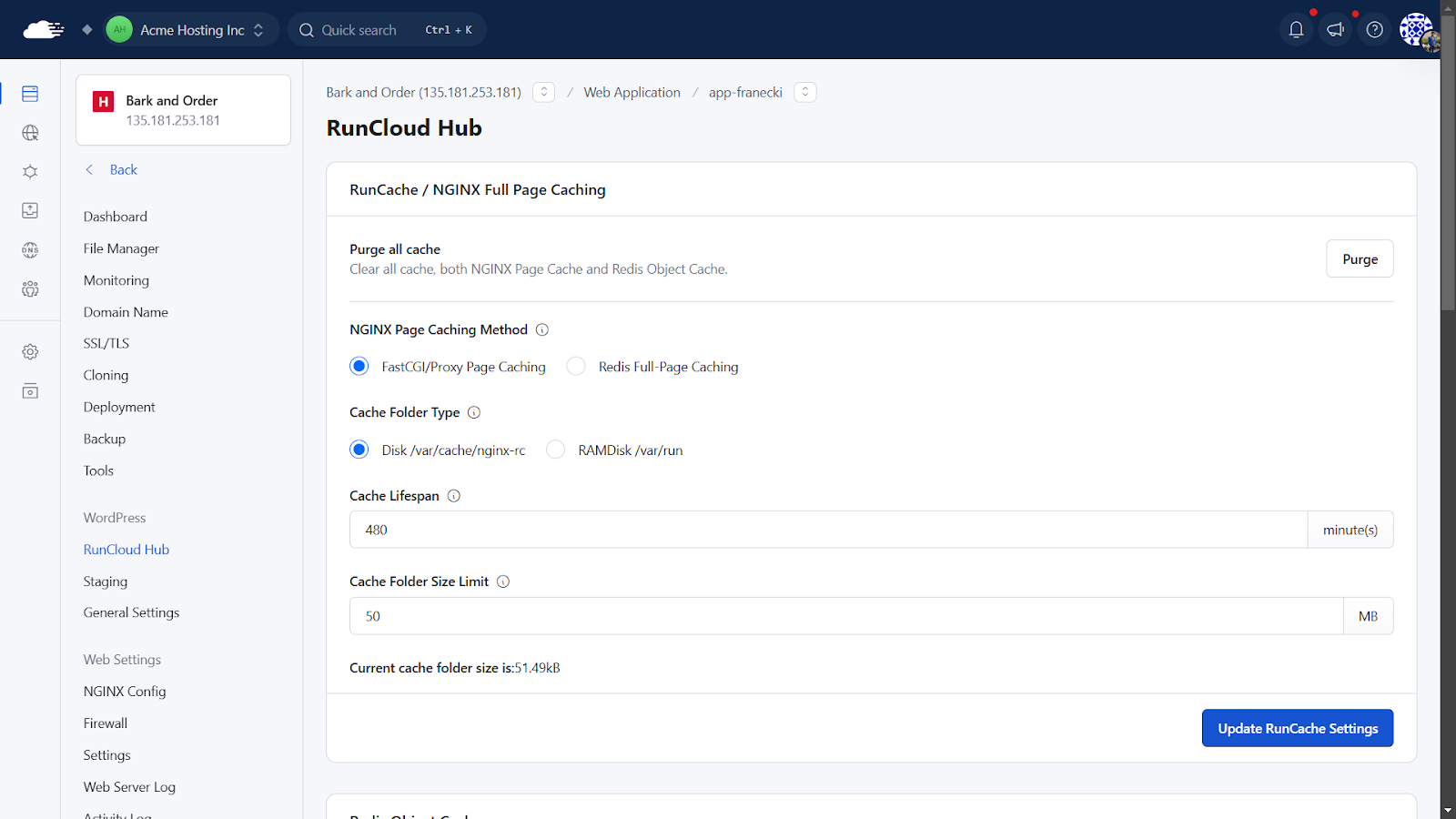 With RunCloud, you can enable server-side caching quickly by installing RunCloud Hub, which includes powerful options like FastCGI and object caching for WordPress.