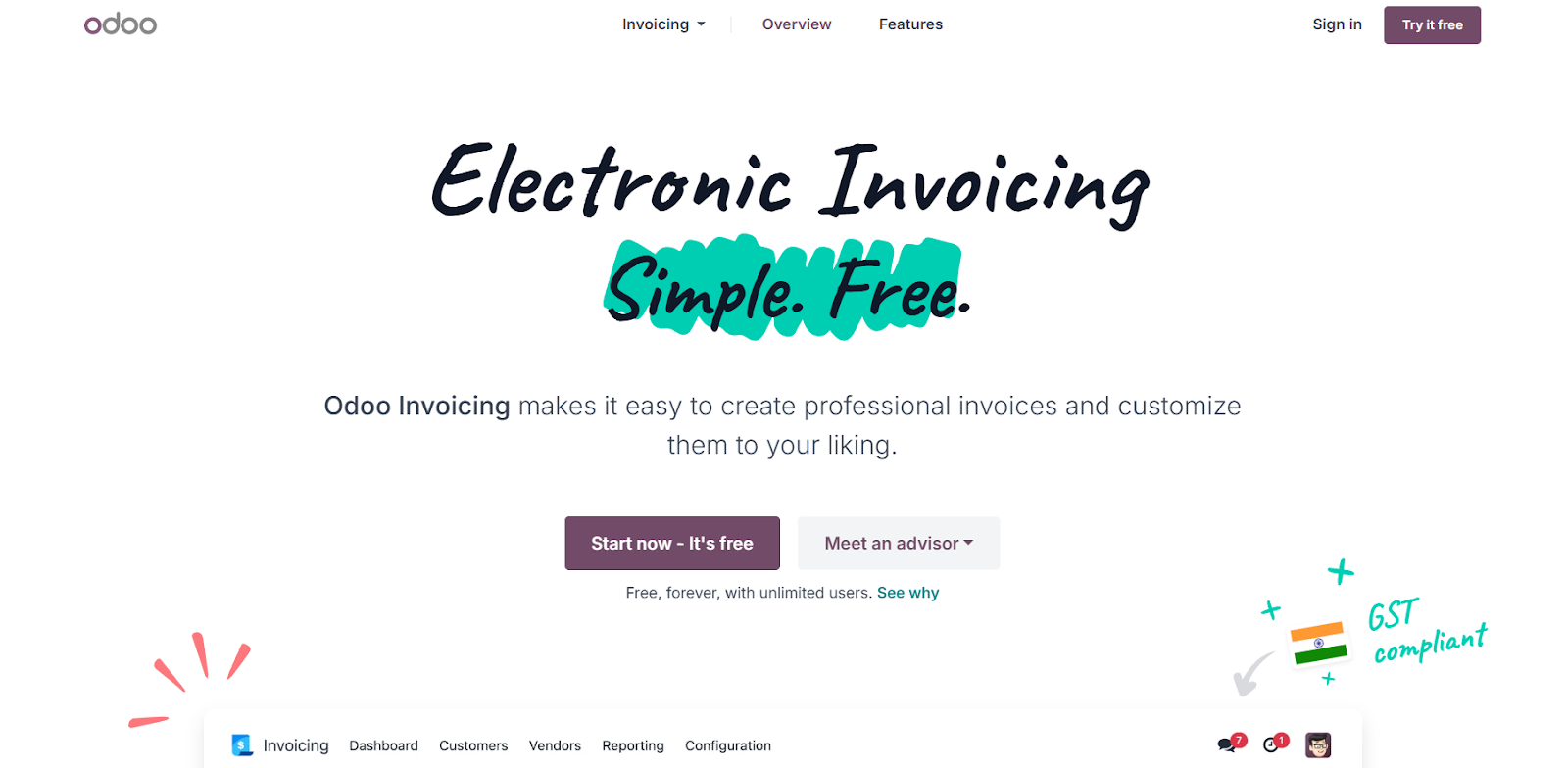 • One App Free Plan: Odoo offers a plan to use a single application for free with unlimited users. Since Invoicing is part of the Accounting app, you can use the full Accounting suite (including invoicing) at no cost. This makes it an incredibly compelling option for small businesses and startups.