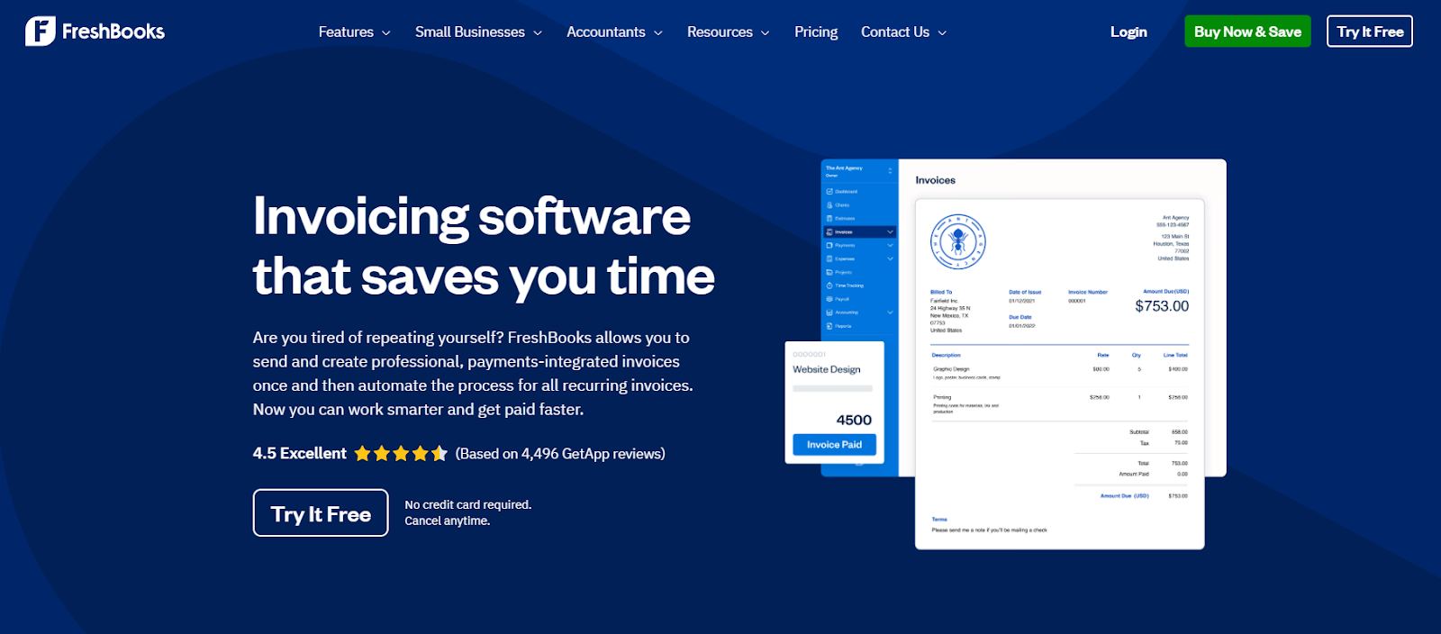 FreshBooks offers invoicing software along with its all-in-one accounting software. This software is designed for service-based small businesses, freelancers, and agencies. The platform is widely recognized for its user-friendly interface, simplifying the creation of professional, customized invoices in minutes.