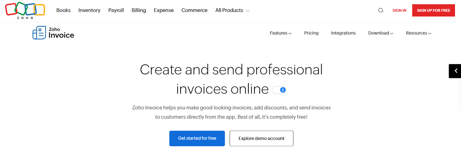 Zoho Invoice is a dedicated invoicing application that’s part of the extensive business software suite. Unlike many other tools discussed in this article, Zoho Invoice is a standalone. It is specifically designed for freelancers and small to medium-sized businesses, and offers a comprehensive set of features to automate and manage the entire billing cycle.