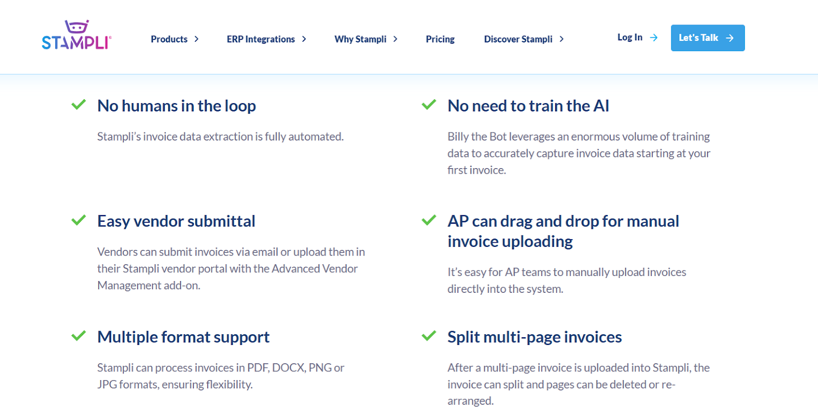 Stampli is designed to be flexible, managing various invoice types, including those with or without purchase orders. It integrates seamlessly with leading ERP systems like NetSuite, Sage Intacct, QuickBooks, and Microsoft Dynamics.