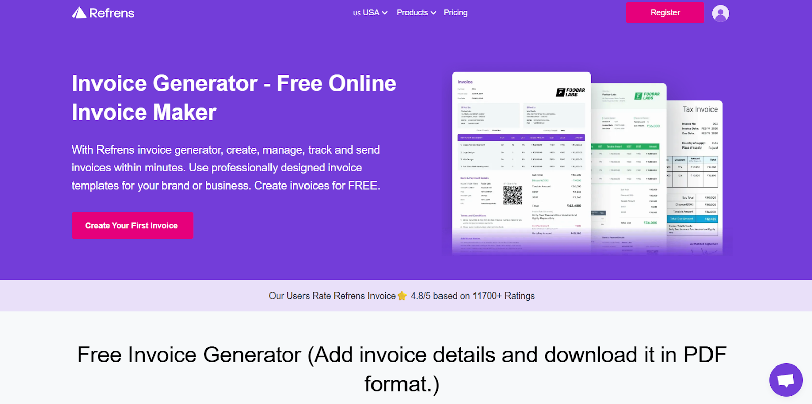 Refrens offers a free online invoice generator for freelancers, consultants, and small agencies. The platform allows users to quickly create professional, customized invoices, with options to add a company logo, signature, and attachments. A significant highlight of the free tool is that the invoices generated do not carry any Refrens branding, a feature often reserved for paid tiers in other tools.