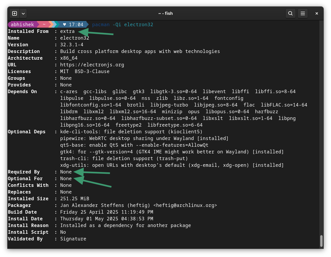 It gave me two interesting details. Electron32 came from the ‘Extra’ (cachyos-extra) repository and it was not required by any packages, not even as an optional dependency.