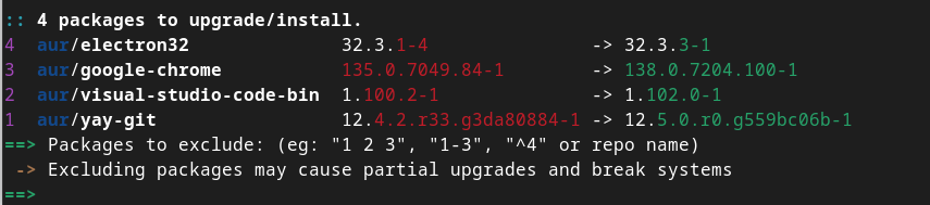 This was interesting and gave me the idea that perhaps it was of no use getting electron’s other version using AUR. So, what I did was to exclude electron from the AUR update.