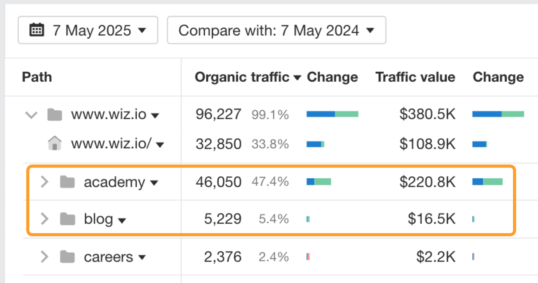 Despite having a similar number of pages as their blog, the Academy outperforms it dramatically across every metric: