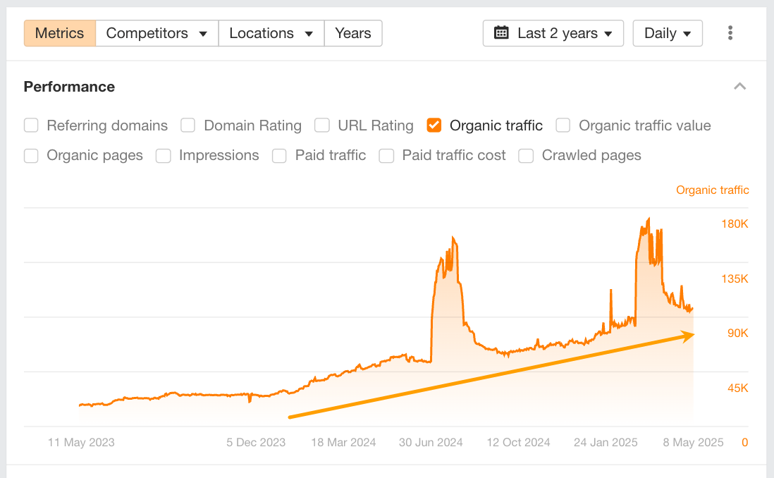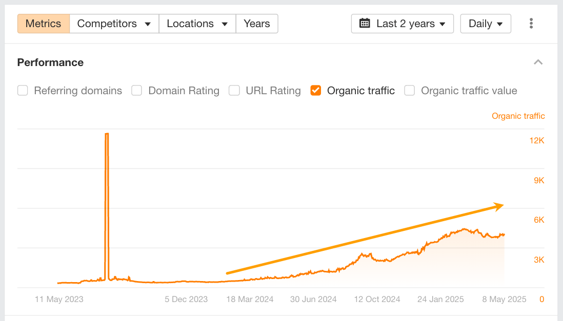 Their traffic began ramping up in April 2024 and has since grown nearly 19x, driven primarily by a surge in high-performing technical blog guides.