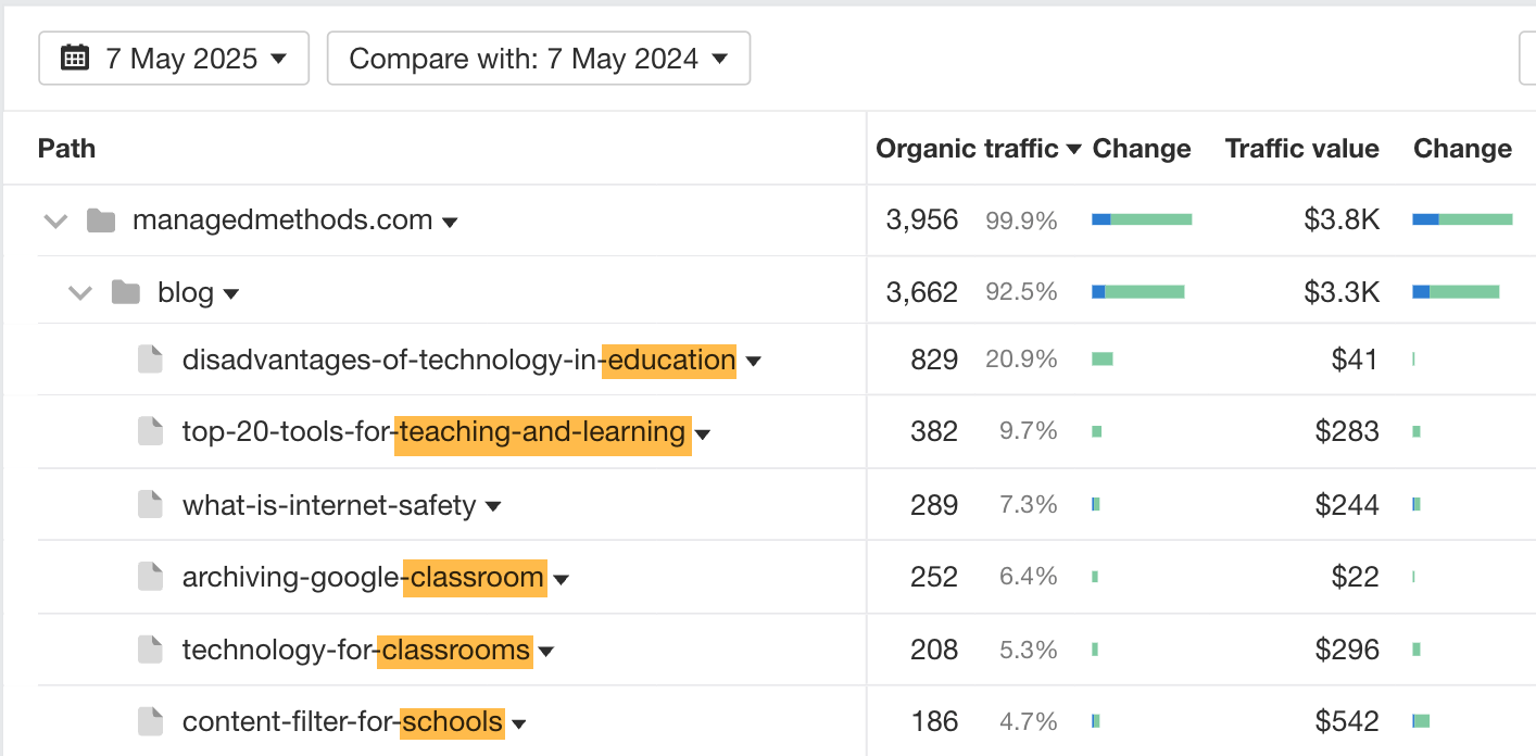 What sets their strategy apart is sustainability. Like Managed Methods, their blog’s performance is distributed across many topics instead of one or two viral posts. They’ve built a library of valuable resources that solve real problems for a high-intent audience — making their SEO strategy both resilient and revenue-aligned.