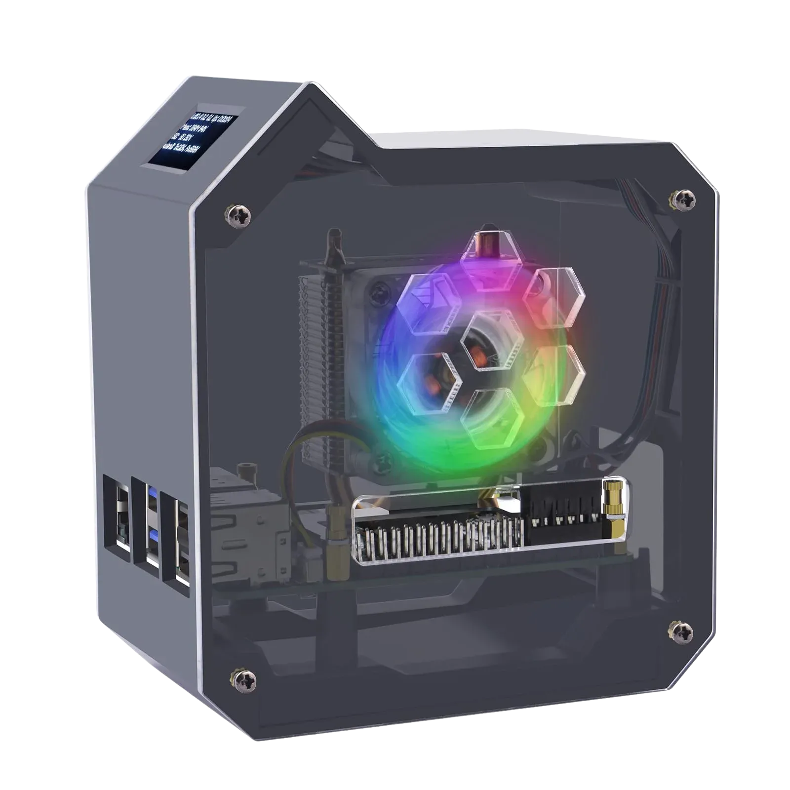 The CUBE Pi features a boxy aluminum alloy construction with 270° panoramic view that clearly displays internal components.