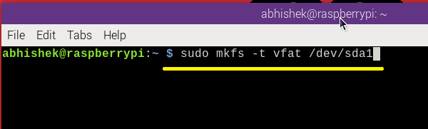 sudo mkfs -t vfat /dev/sda1
