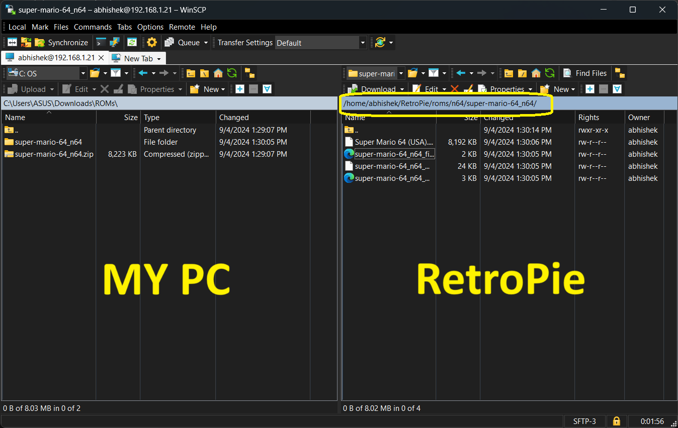 Here I’m using WinSCP to transfer my ROMs using SFTP: