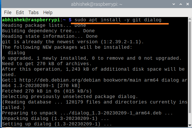 First, you’ll need the “dialog” package, which the RetroPie setup script uses to create dialog boxes in the terminal. Next, the “git” package is crucial as it allows us to clone the setup script repository directly to the Raspberry Pi.