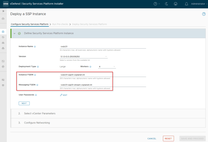 SSP Instance name must be unique and will be used as a prefix for the Instance VMs and other inventory objects that the workflow will create. We should not deploy multiple SSP Instances with the same instance name under the same vCenter. The fields for Instance and messaging FQDNs come from the DNS record that we created earlier.