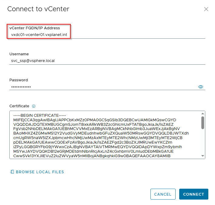 We will now provide the configuration parameters for the management vCenter server where the SSP Instance will be deployed. The workflow requires vCenter root certificate to be presented in order to establish trust with the vCenter server.