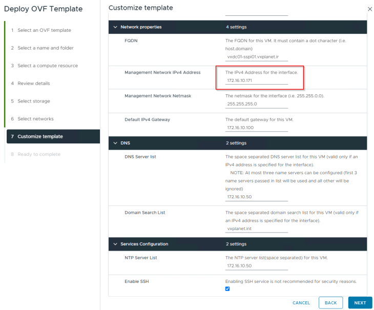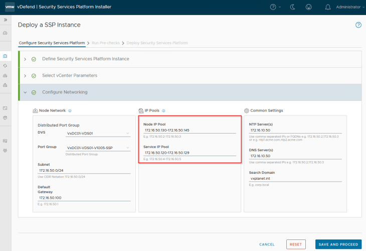 As discussed earlier, we are using a routed network topology for the SSP deployment, hence we will choose the network ‘VxDC01-VDS01-V1005-SSP’. We will provide a range of IP addresses from this subnet for the Instance VMs (called Node IP Pool) and Platform / Kubernetes services (called Service IP Pool). To support full scale SSP deployment, 16 IP addresses for Node IP Pool and 12 IP addresses for Service IP Pool are required.