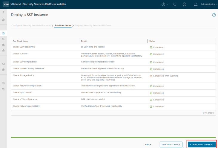 We see a warning related to storage requirements, but that is fine, we will skip this as this is a lab environment and we don’t plan to ingest much volume of data to SSP. Let’s click on ‘Start Deployment’ and wait for the deployment to complete.