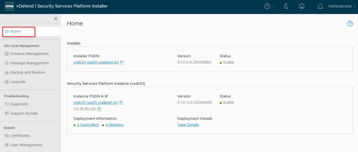 Let’s login to the SSP Installer UI and navigate to the Home section. This section shows basic information about the deployment including the FQDNs, version and summary status.