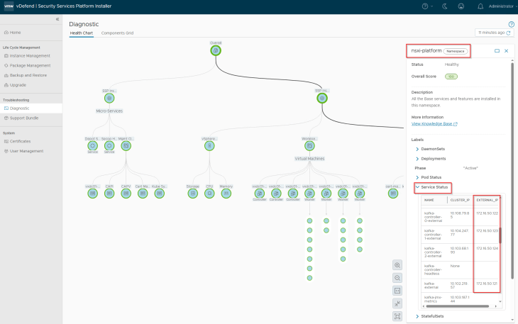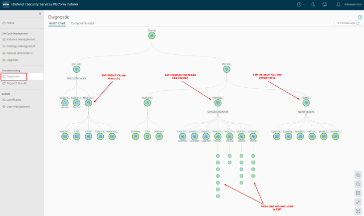 SSP Installer has an inbuild diagnostics section that shows a map / grid view of the overall component health status of the SSP Instance.