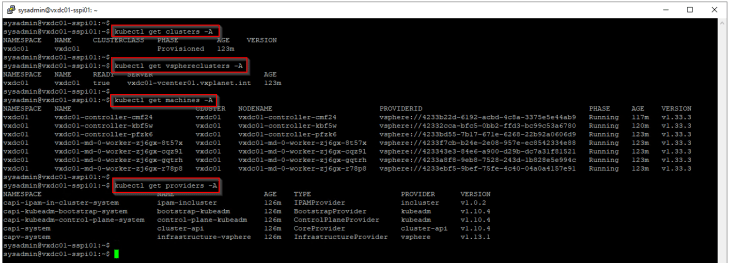 The above commands are related to fetching the information about the deployed workload cluster, cluster machines etc from the management K8S cluster.
