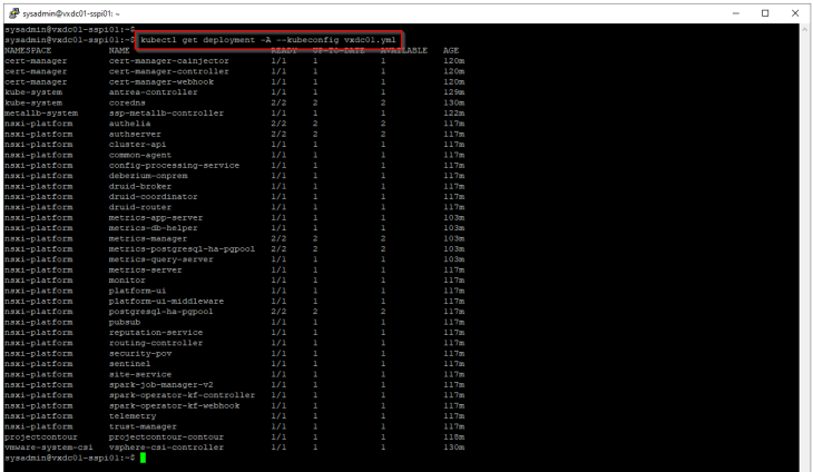SSP Instance VM has the necessary cli utilities (including kubectl) needed to access and manage the SSP platform. Let’s ssh to the SSP Installer VM and run A few kubectl commands against the management K8S cluster.