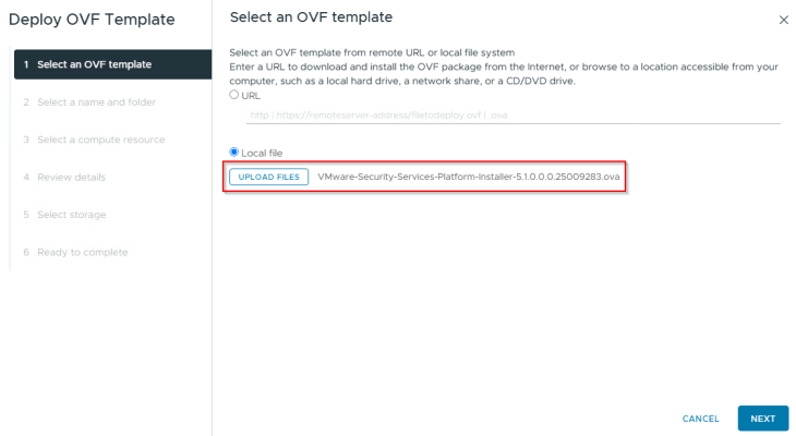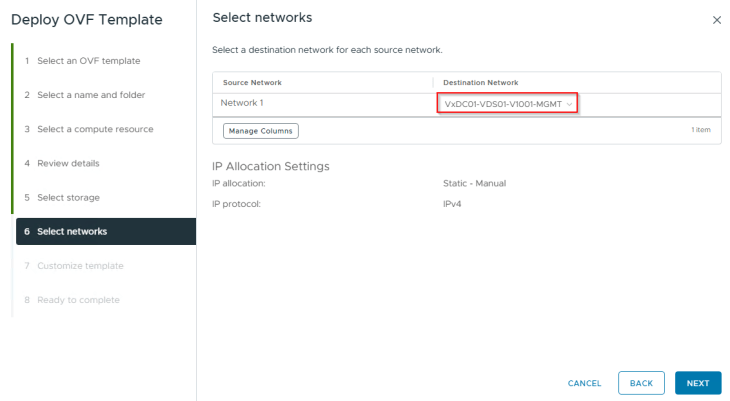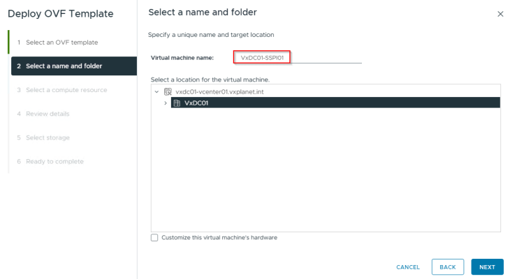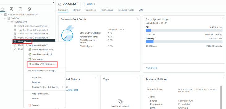 We will deploy the SSP Installer to the management vSphere cluster VxDC01-C01 under the resource pool RP-MGMT via ova import, like other ova-based appliance deployments.