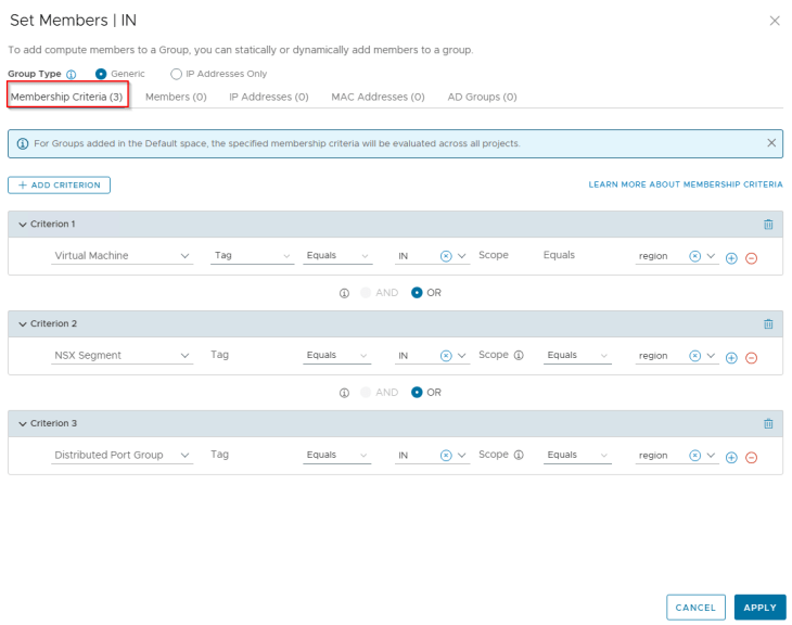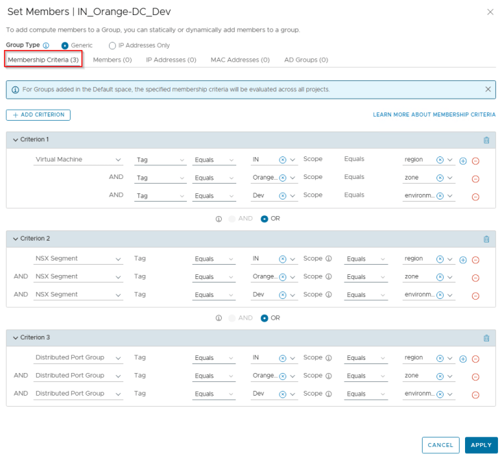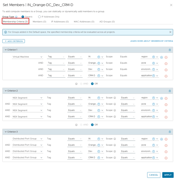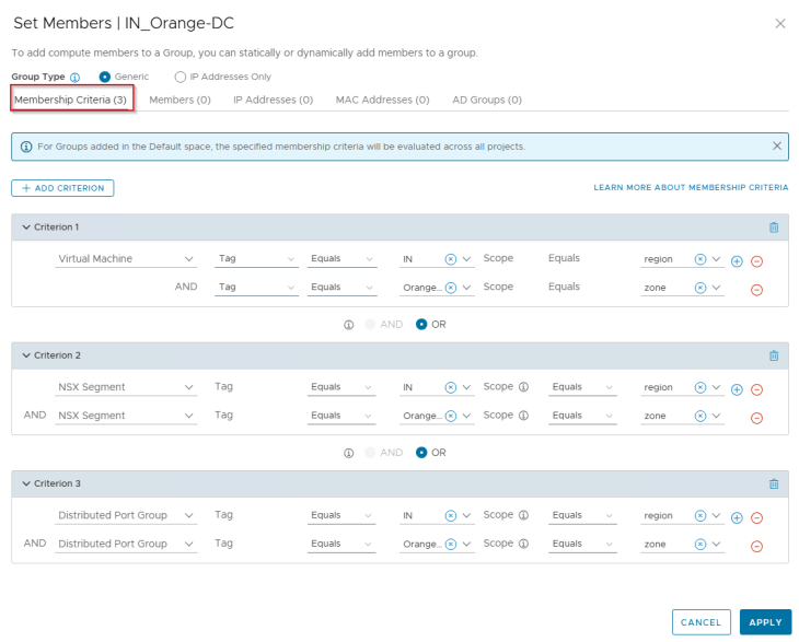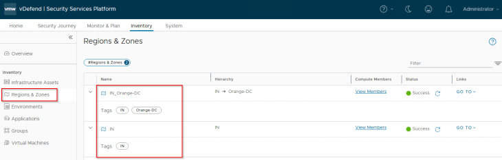 Regions and Zones in SSP are realized as security groups in NSX with a dynamic membership criteria. At this stage, the Region and Zone scope information included in the CSV has been used to tag the VMs for this hierarchy level, and the VMs will become part of the respective security groups in NSX.
