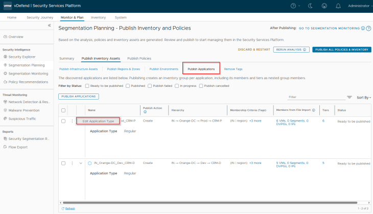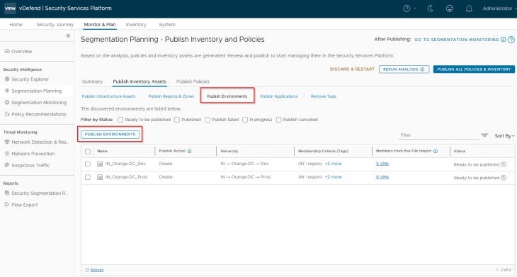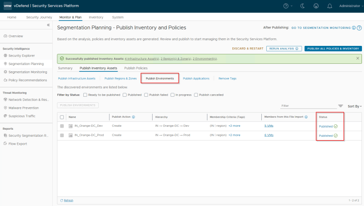 Navigate to Segmentation Planning -> Publish Inventory Assets -> Publish Environments, select the two environments (Prod and Dev) that are recommended and click on Publish. Note that environments are named based on the hierarchy.