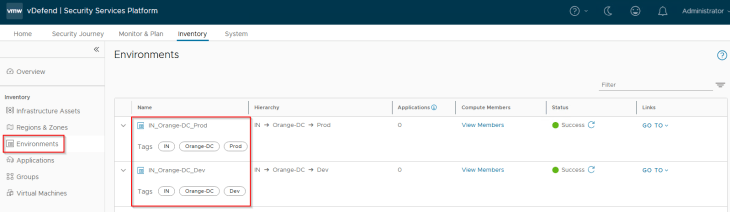 Environments in SSP are realized as security groups in NSX with a dynamic membership criteria. At this stage, the Environment scope information included in the CSV has been used to tag the VMs for this hierarchy level, and will become part of the respective security groups in NSX. The respective Environment tags are applied on top of the existing Region and Zone tags.
