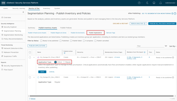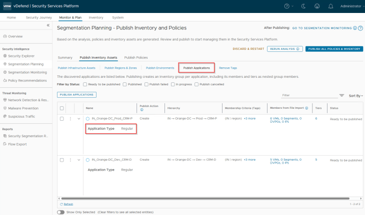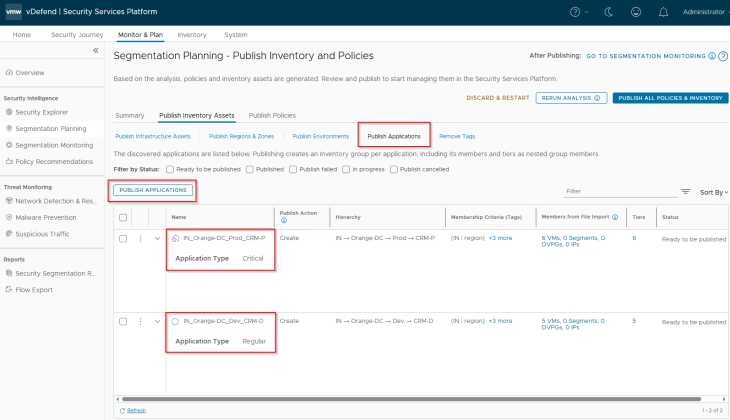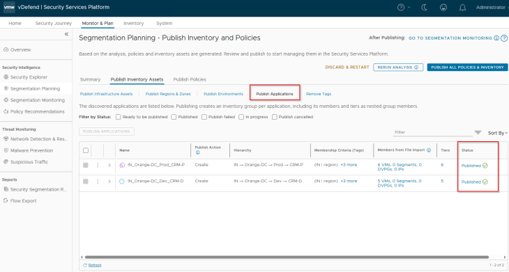 Now let’s select the two applications (CRM-P and CRM-D) and click on Publish. Note that applications are named based on the hierarchy unless we are promoting existing groups from NSX.