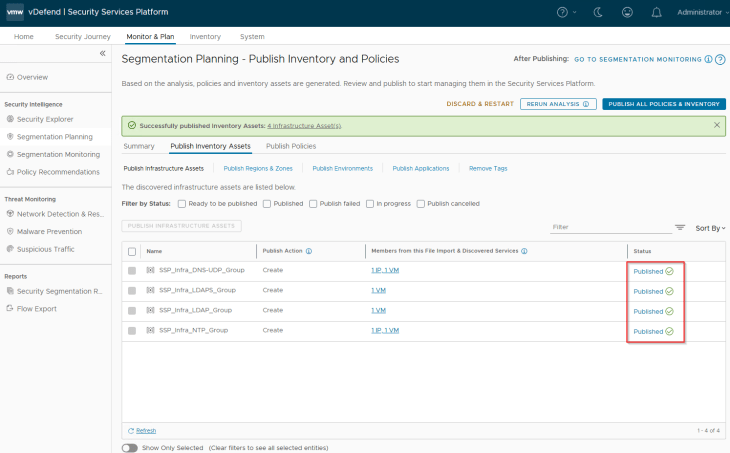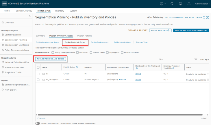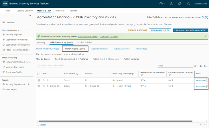 Navigate to Segmentation Planning -> Publish Inventory Assets -> Publish Regions and Zones, select the regions and zones that are recommended and click on Publish. During the initial publish we see the publish action as ‘Create’, however it’s also possible that the regions or zones may already exist as part of a previous import. In this case, we see the action against those assets as ‘Refresh’ as this process updates the existing asset’s membership with additional members or make changes in the assigned tags. We also have another publish action called ‘Promote’ in scenarios where we promote an existing NSX Group as Region or Zone in SSP.