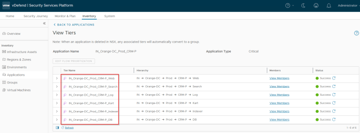 Applications in SSP are realized as security groups in NSX with a dynamic membership criteria. At this stage, the Application and Application Tier scope information included in the CSV has been used to tag the VMs for this hierarchy level, and will become part of the respective security groups in NSX. The respective Application and Application Tier tags are applied on top of the existing Region, Zone and Environment tags.