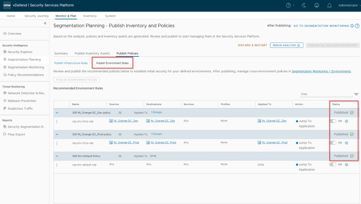 Navigate to Segmentation Planning -> Publish Policies -> Publish Environment Rules, and hit on Publish. The default environment rules are only intra-environmental with an action of ‘Jump to Application’ that allows the traffic to be further analysed against Application category microsegmentation rules. Changing the action to ‘Allow’ simply means Environment / zone segmentation use case, where the traffic is allowed and is not analysed against Application category rules.