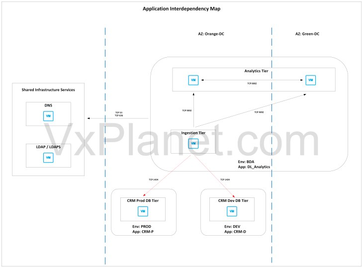 The below sketch shows the application interdependency map. Note that there is an inter-environment communication from the BDA Ingestion Tier (in the BDA environment) to the CRM-Prod DB Tier (in the Prod environment) and the CRM-Dev DB Tier (in the Dev environment).