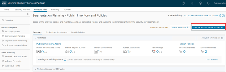 Let’s run a recommendation including a segmentation strategy with a default rule action as Drop (as we are confident about the expected flows for the application) and publish to NSX manager.