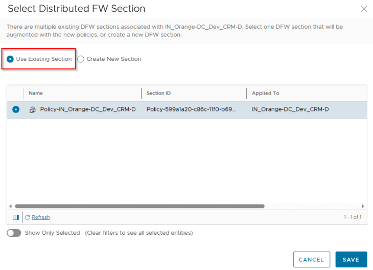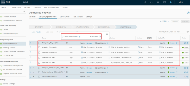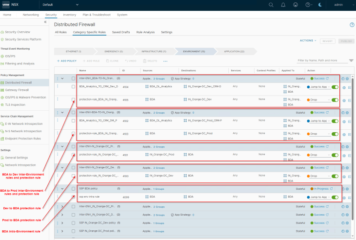 Similar to how we did in Part 6, we will review the inter-environmental traffic flows, create exception rules, and add inter-environmental protection rule with an action of Drop. We do the protection rule action as Drop because we are already aware that there are no inter-environmental flows except the BDA Ingestion Tier (in the BDA environment) communicating with the CRM-Prod DB Tier (in the Prod environment) and the CRM-Dev DB Tier (in the Dev environment). In a typical production environment, we start with an action of ‘Jump to Application’, monitor the protection rule periodically, add incremental rules, and eventually change to action to Drop / Reject if there is nothing else to exempt. This could take weeks depending on the scale, necessary reviews and approvals.