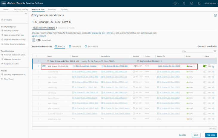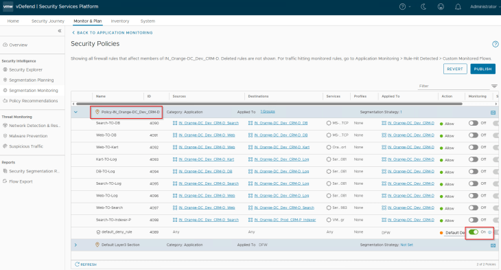 We will start with the CRM Dev application. Notice that we have a segmentation strategy with a default Drop rule applied to the policy. Flow monitoring is currently enabled on this default rule.