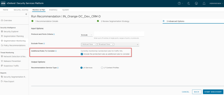 Under the Advanced Options, we will enable the flag to include Protected rules to be considered for recommendation. This is important, else recommendation will only look for unprotected flows and skip the blocked flows under the default monitored rule.